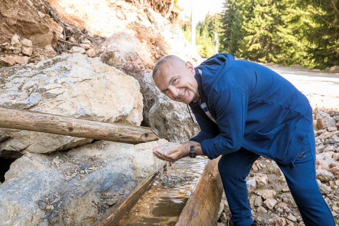 “Të dashur miq, nga Bjeshkët përrallore të Rugovës, mes pishave të larta e livadheve mahnitëse, aty ku ajri i pastër dhe uji i kristaltë i burimeve malore të mbushin me energji, ju uroj të gjithëve një të dielë të mbarë. ??”, shkruan Meta, teksa shfaqet i veshur sportiv dhe me atlete dhe shijon ujin e pastër dhe të ftohtë të Bjeshkëve.