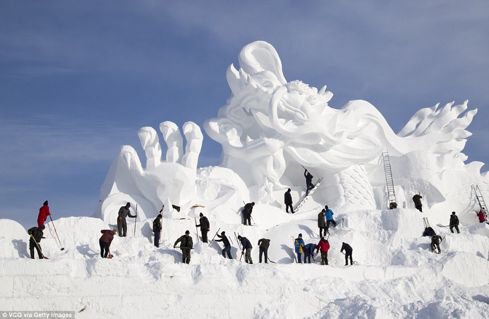 Ky dragua i pabesueshëm prej dëbore që është 80 metra i gjata dhe 20 i gjerë ka mahnitur vizitorët në Kinë dhe ende nuk ka përfunduar.