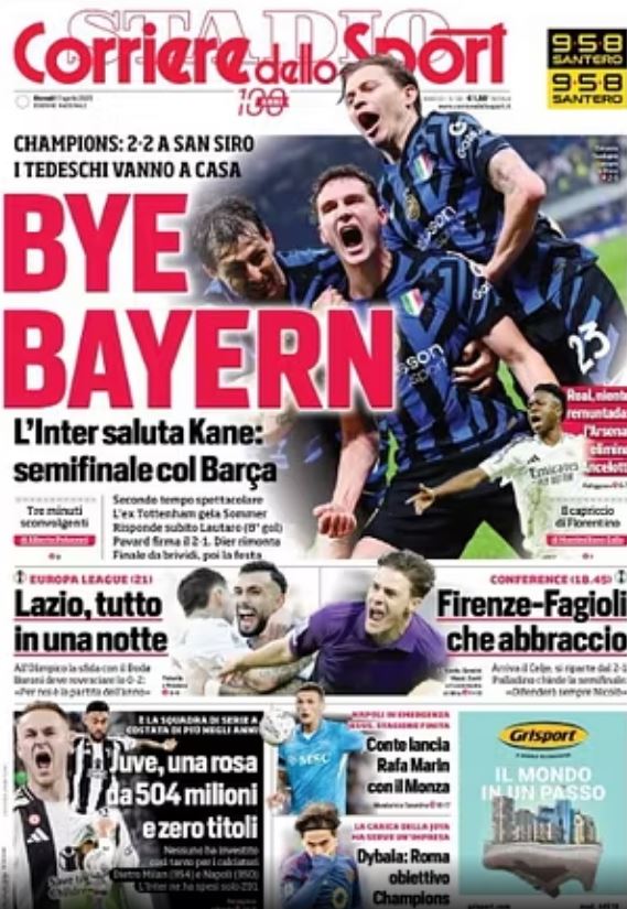 Suksesi i Inter ndaj Bayern solli festë në të përditshmet italiane: “Bye Bayern, Inter përshëndet Kane, në gjysmëfinale me Barcelonën”, shkruan Corriere dello Sport në faqen e parë.