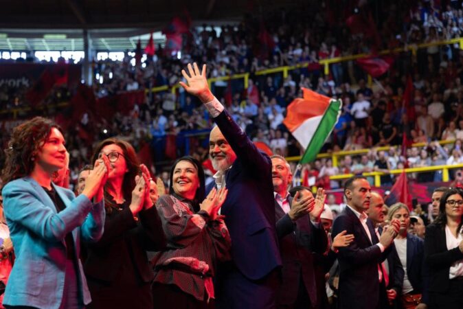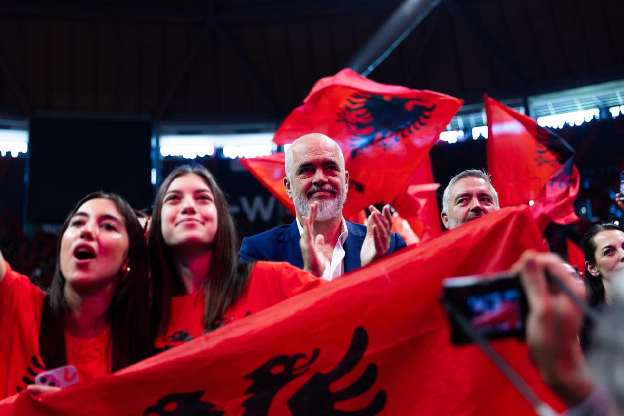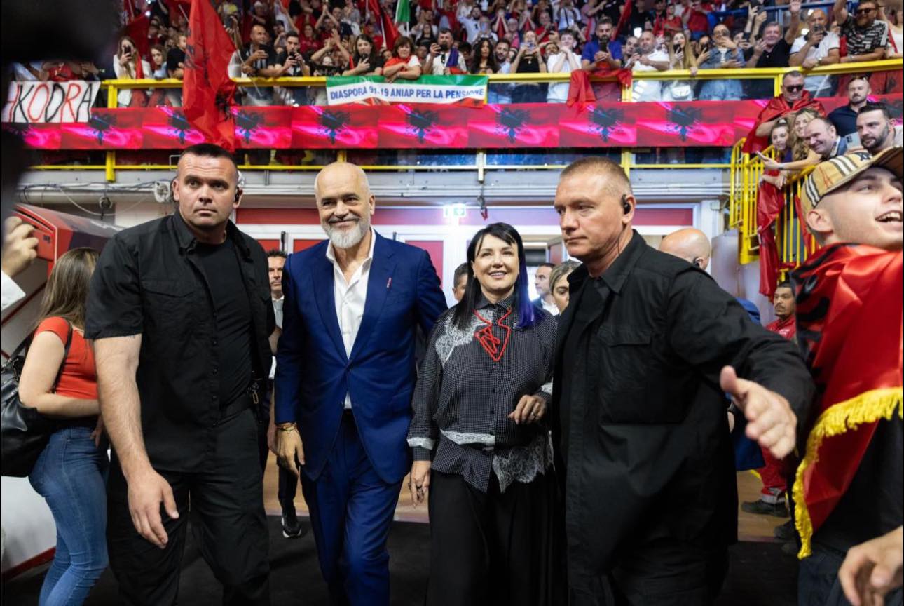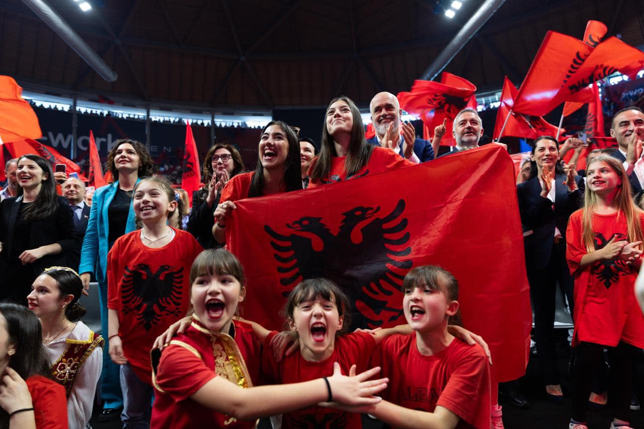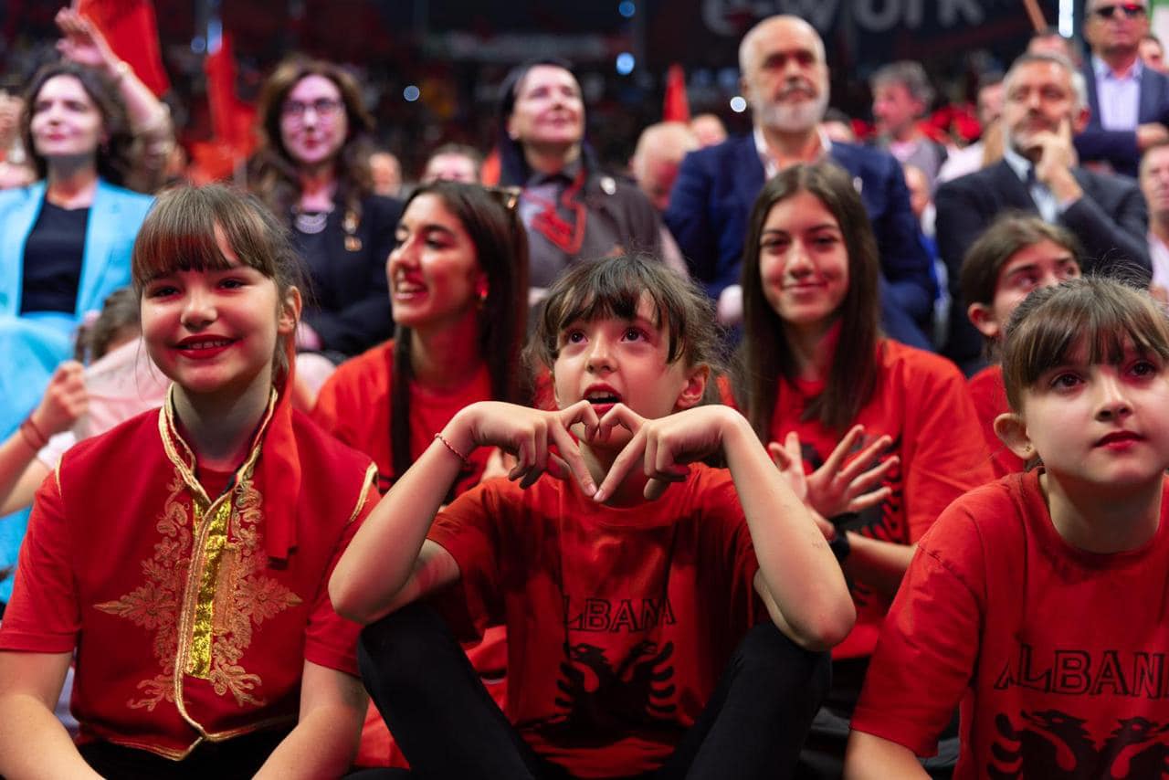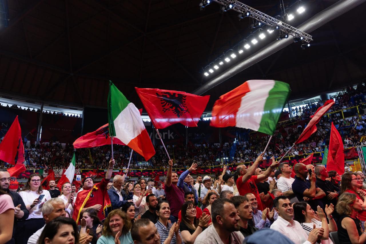Në sallën e mbushur me mijëra shqiptarë mbizotëronin ngjyrat kombëtare kuq e zi dhe simbolet kombëtare, por nuk munguan as flamujt italianë.