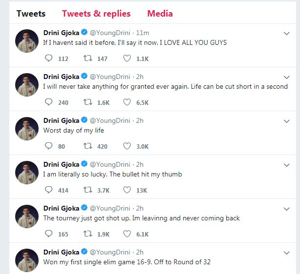 Ai është 19-vjecari Drini Gjoka, i cili ishte pjesë e turneut dhe është lënduar lehtë në dorë. I riu shqiptar thotë përmes postimeve në Twitter se ishte me fat që ka shpëtuar.
