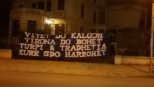 Një banderolë e madhe përpara Vilës Gold, që është në pronësi të Halilit është bëma e radhës së tifozëve bardhë-e-blu.