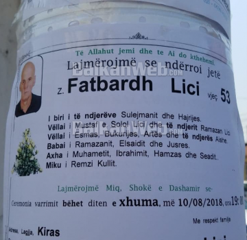 SHKODËR- Plot 15 plumba janë zbrazur mbi 53-vjeçarin Fatbardh Lici mëngjesin e sotëm në Shkodër, pak metra larg banesës së tij, ndërsa kishte dalë si zakonisht për kafen e mëngjesit. Lici ishte babai i tre fëmijëve, dy djemve dhe një vajze. Familja Lici ka hapur dyert e mortit, ndërsa 53-vjeçari do të përcillet për në banesën e fundit sot në orën 19:00.