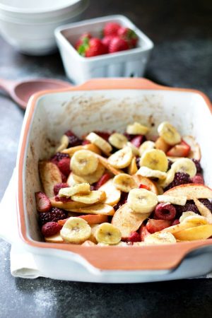 Qërojmë mollët nga lëkura, largojmë pjesën e farave dhe më pas i presim mollët në feta duke i vendosur në një tavë. Presim bananet në feta dhe i bashkojmë me mollët. I spërkasim frutat me pak lëng limoni dhe pak kanellë. Sipas dëshirës mund të shtojmë dhe pak fruta të thata. Në një tas të vogël vendosim pak miell dhe 1-2 lugë gjalpë. E përziejmë miellin dhe gjalpin me dorë dhe brumin e realizuar e thërrmojmë mbi frutat duke mbuluar të gjithë sipërfaqen e tyre. I vendosim frutat të piqen në furrë në temperaturën 180 gradë Celsius për 20-25 minuta.