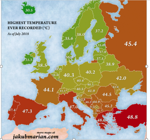 Në krahasim me vendet e tjera, klima në Europë është shumë më e butë, shkruan “monitor”. Temperatura më e lartë në Europë është shënuar në Athinë, Greqi më 10 korrik 1977, ku termometri tregoi 48.0° C. Harta më poshtë tregon temperaturat më të larta të regjistruara zyrtarisht në vendet evropiane (bazohet kryesisht në këtë listë).