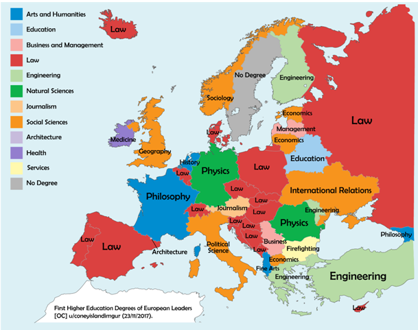 Në kundërshti të plotë me diplomën, që në rang botëror ka shpërndarjen më të madhe, ajo e biznesit, duket se lidërët europian janë më tepër të fushës së shkencave humane. Liderë të tjerë sakaq sipas hartës, kanë studiuar për sociologji, marrëdhënie ndërkombëtare, gazetari, sociologji. Vetëm lideri Italian ka studiuar për Shkenca Politike.
