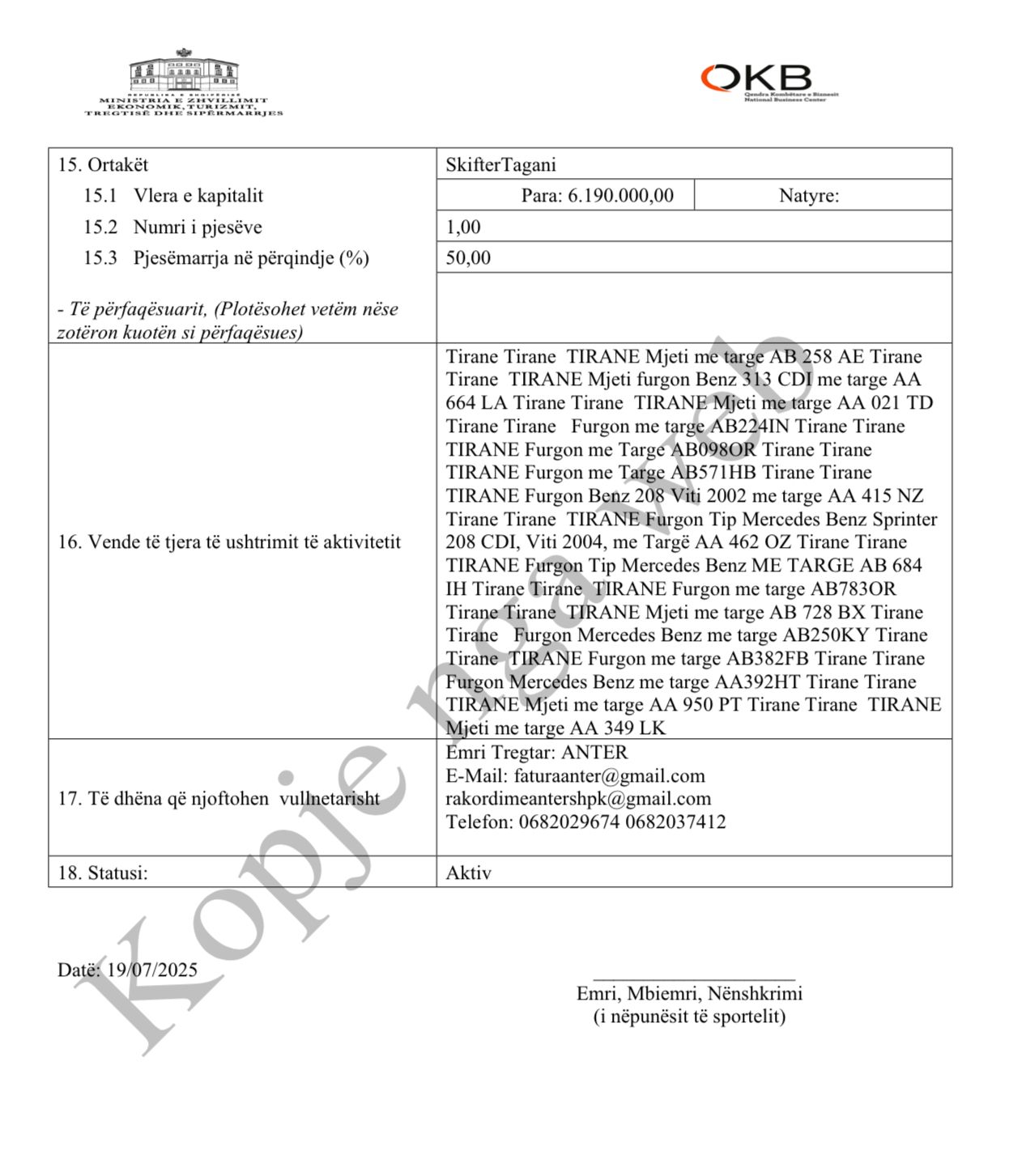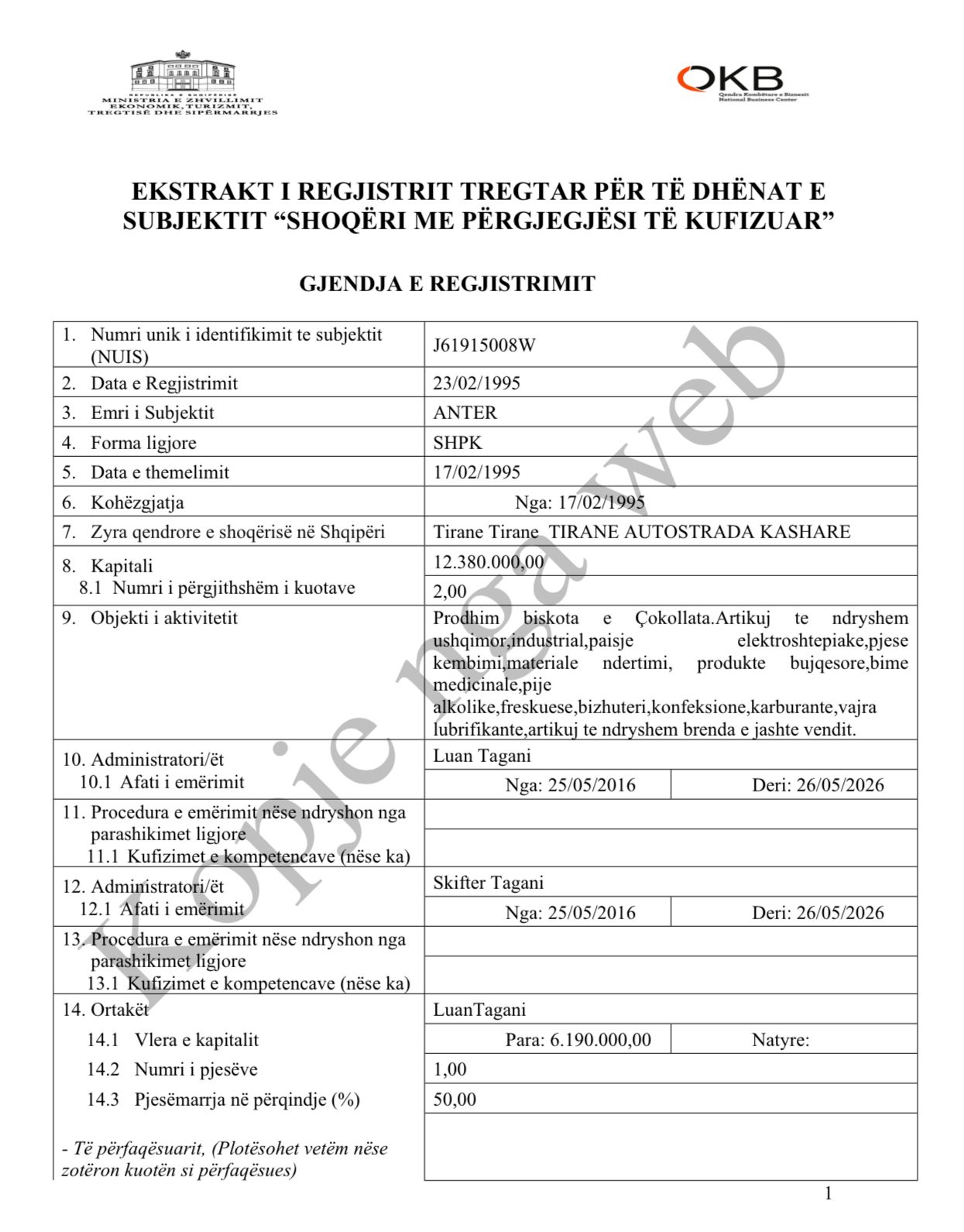 Skifter Tagani është edhe pronar i ANTER SHPK, për prodhim biskota dhe çokollata.