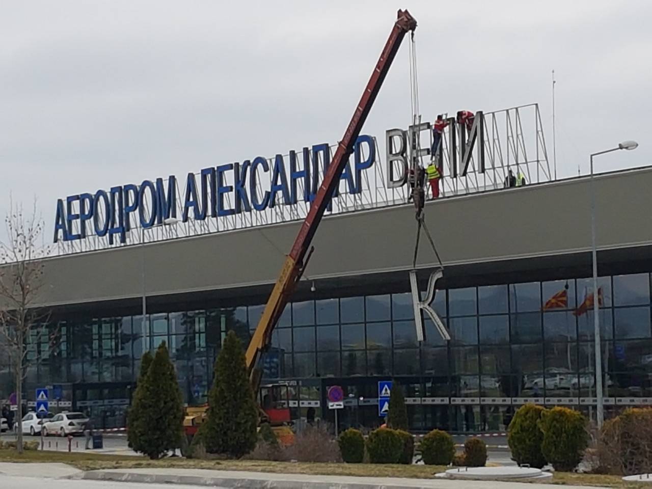 Pas hyrjes në fuqi të vendimit të Qeverisë për riemërtimin e aeroportit të Shkupit dhe Autostradës “Aleksandri i Madh”, në këto momente po bëhet ndryshimi i mbishkrimeve në aeroport.
