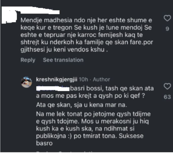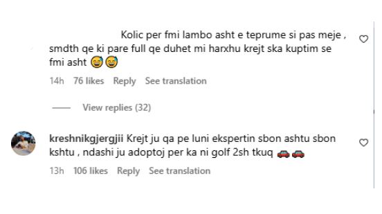 “Karrocë për fëmijë lambo është e tepruar si pas meje nuk do të thotë që ke para e që duhet t’i shpenzosh të gjitha, nuk ka kuptim se fëmijë është”, ka shkruar një nga komentuesit, ndërsa nuk u vonua dhe përgjigjs nga bashkëkshrti i Dafinës, Kreshniku.