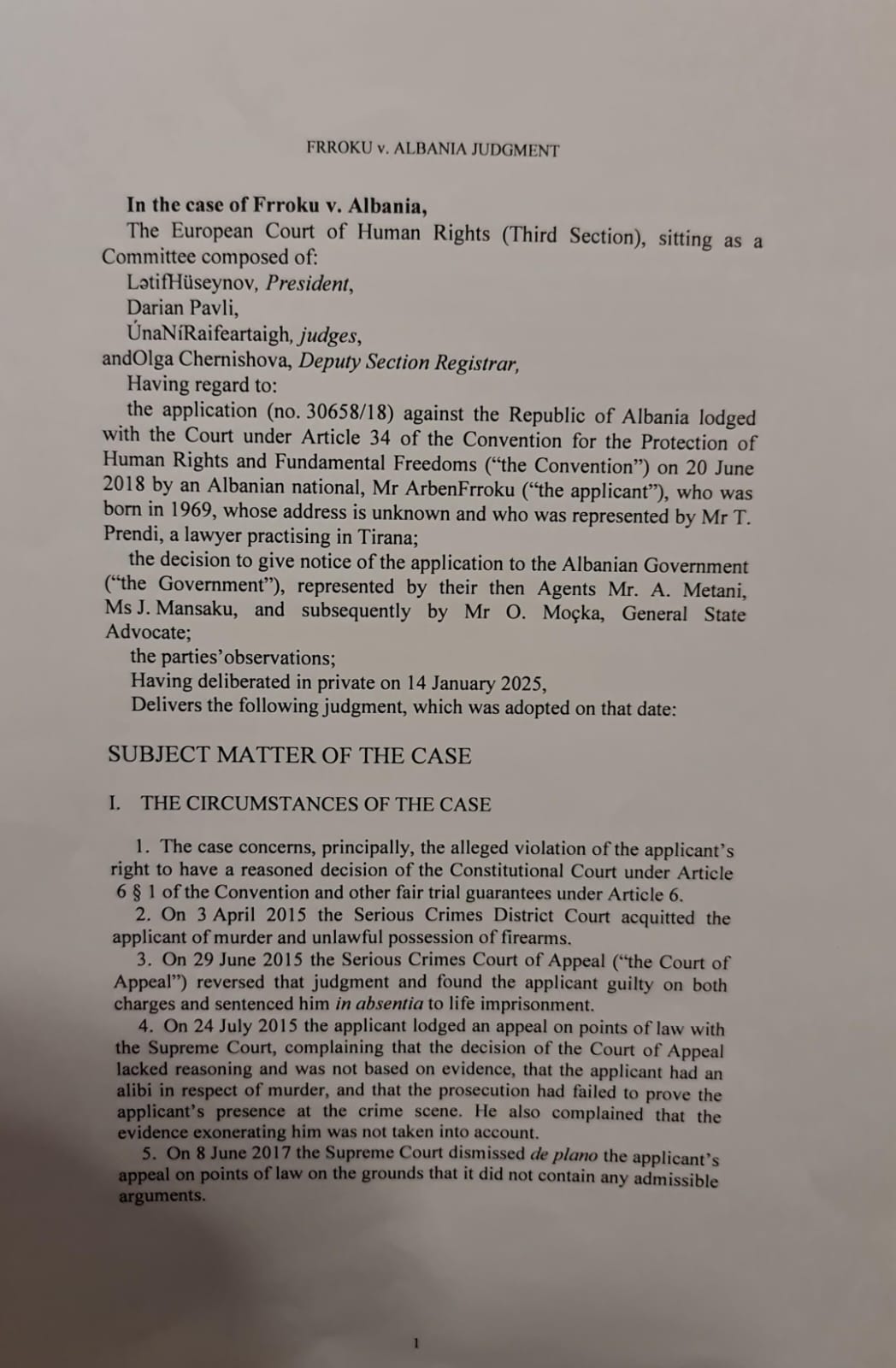 Dënimi i Arben Frrokut është konsideruar i padrejtë nga Gjykata Evropiane e të Drejtave të Njeriut, duke e bërë rihapjen e çështjes një mundësi objektive për zgjidhjen përfundimtare të saj.