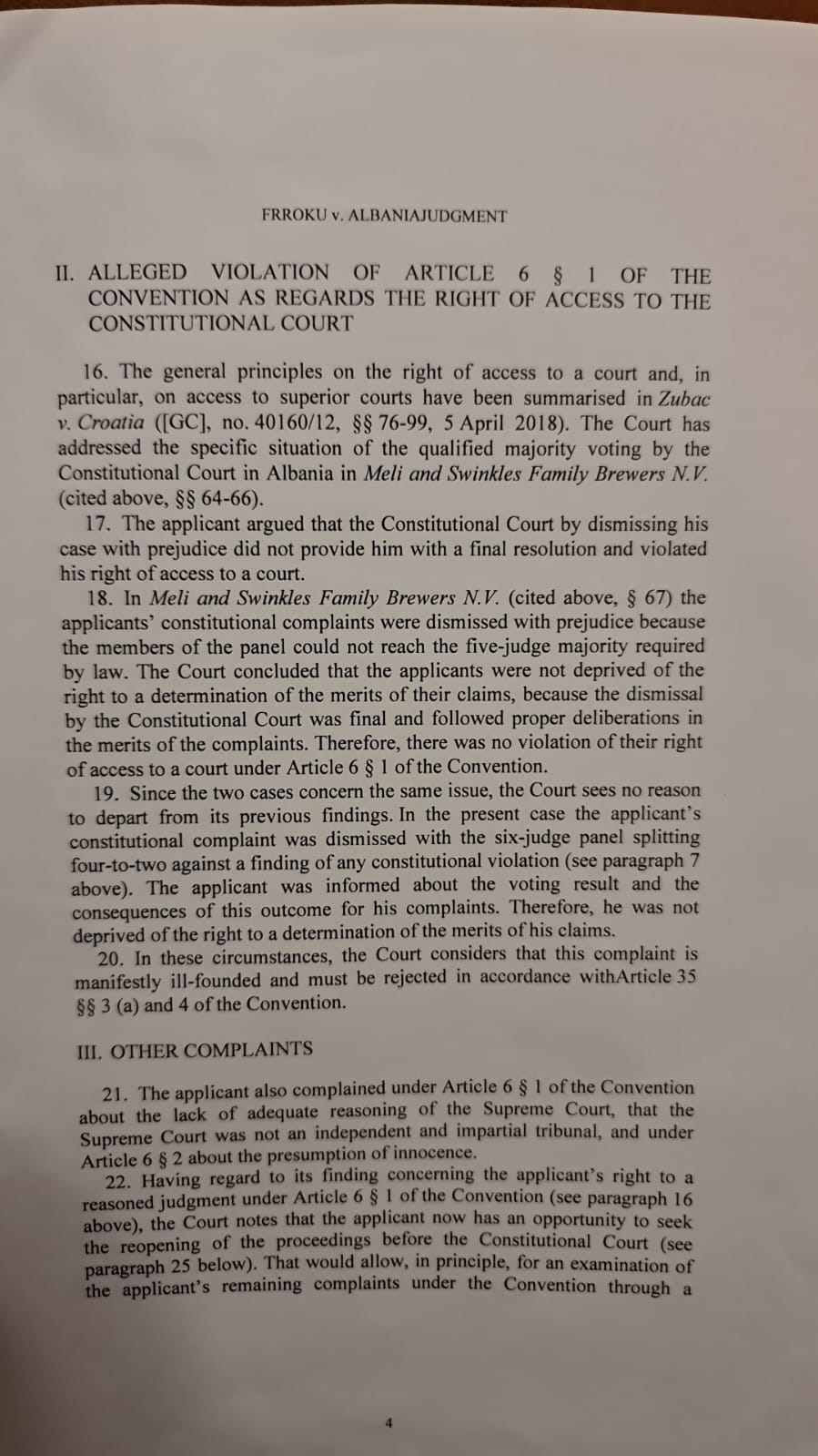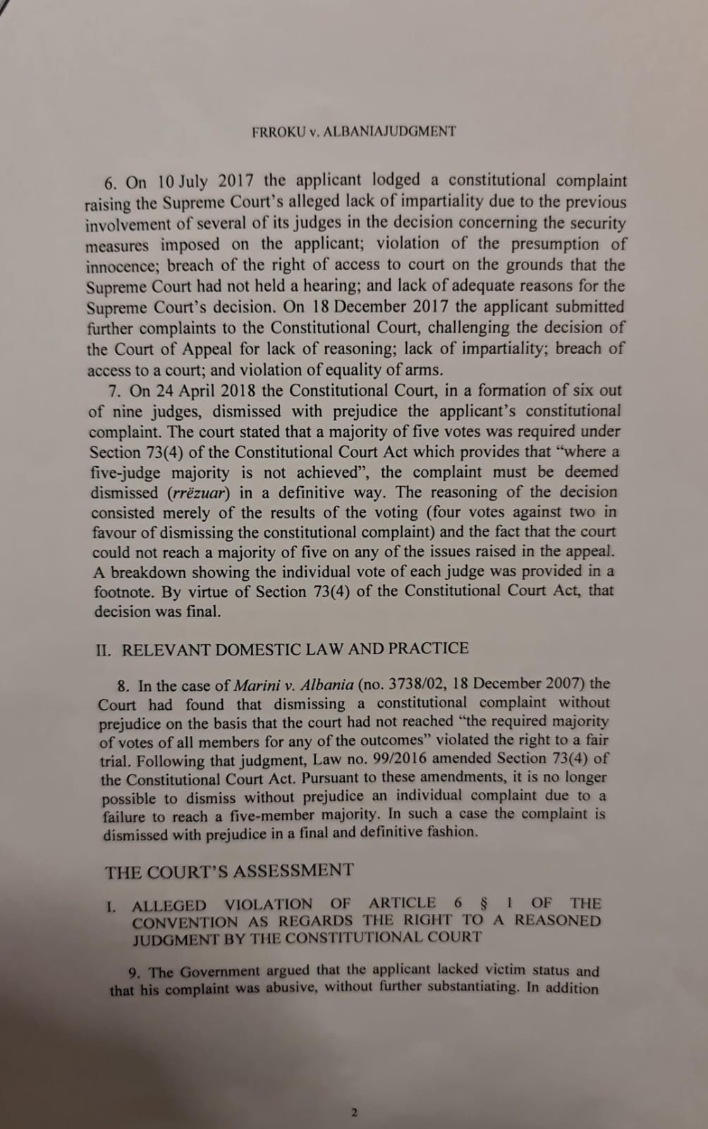 Gjykata Evropiane e të Drejtave të Njeriut në Strasburg vlerëson se procesi gjyqësor ndaj Arben Frrokut ka përmbajtur shkelje të të drejtave të tij dhe, si i tillë, duhet të rigjykohet, të paktën nga Gjykata Kushtetuese e Shqipërisë.