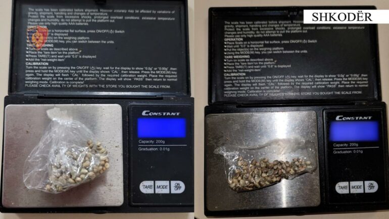 Në rrugën “13 Dhjetori”, shërbimet e Policisë kanë kapur në flagrancë shtetasin V. N., 18 vjeç, banues në fshatin Selcë, Malësi e Madhe, të cilit gjatë kontrollit fizik i kanë gjetur një qese me 156 fara cannabis sativa. Farat u sekuestrua në cilësinë e provës materiale. Materialet procedurale i kaluan Prokurorisë pranë Gjykatës së Shkallës së Parë të Juridiksionit të Përgjithshëm Shkodër, për veprime të mëtejshme, për veprën penale “Prodhimi dhe shitja e narkotikëve”.