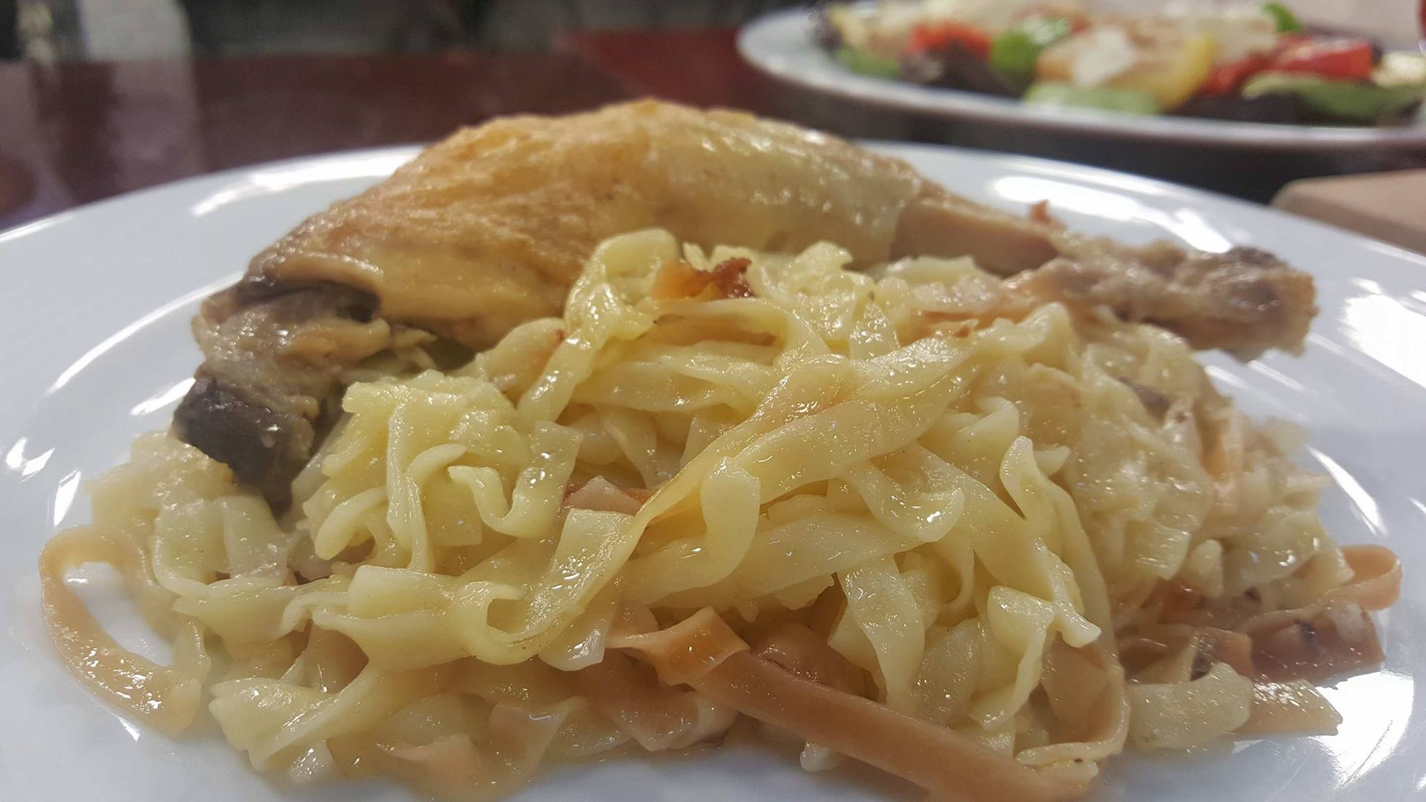 Fillimisht lajmë pulën dhe pasi e kemi prerë e vendosim të ziejë atë derisa piruni të ngulet lehtë në të. Ndërkohë grijmë qepën në rende. Shkrijmë gjalpin dhe kaurdisim qepën për 2-3 minuta pa i dhënë ngjyrë. Hedhim pak kripë dhe piper dhe nëse dëshirojmë dhe pak piper të kuq. Vendosim jufkat në një tavë dhe i spërkasim me gjalpin, i vendosim ato në furrën e nxehtë për 5 minuta sa të ngrohen dhe të zverdhen pak. Shtojmë lëngun e pulës (1 cm nën nivelin e jufkave), vendosim copat e mishit të pulës dhe e vendosim përsëri në furrë derisa jufkat të përthithin lëngun e pulës dhe copat e mishit të marrin ngjyrë të kuqerremtë (rreth 10-15 minuta në temperaturën 200 gradë Celsius).