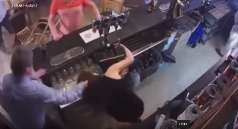 42-vjeçari Tim Sheahan shfaqet teksa bën sherr me disa burra në barin e lokalit. Më pas, Sheahan kap nga flokët gruan e tij, Jurgita Janusauskiene dhe e tërheq disa metra.