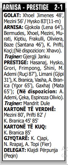 Skuadra e Arnisës shumë pak herë vizitoi portën e Prestige dhe vetëm në minutën e 45-të rrezikoi seriozisht, por topi i goditur me kokë nga Mezini përfundoi në duart e portierit Hasanaj. Në fraksionin e dytë, Arnisa zhbllokon shifrat që në minutën e 48-të pas një aksioni të bukur të Muratit dhe një asist te Xhoel, që me një gjuajtje tokazi shënon. Vendësit nuk ndalen dhe shënojnë edhe golin e dytë me anë të Mezinit me kokë, pas krosimit nga këndi në minutën e 55- të.