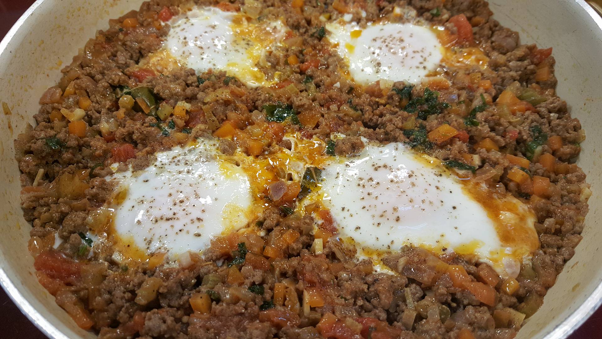 Shtojmë qumështin dhe e lemë të shterojë pak në temperaturë të ulët. Shtojmë pak majdanoz, e trazojmë të ulë volumin dhe në fund shtojmë 4 kokrra vezë syze. E mbulojmë tiganin me kapak që veza të mpikset dhe e lemë të piqet. Në fund kur ta servirim nëse dëshirojmë mund të shtojmë 1 lugë kafeje vaj ulliri mbi çdo vezë.