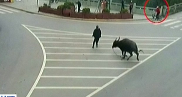 Një buall i tërbuar ka plagosur 14 persona nëpër rrugët e provincës Sichuan të Kinës. Media shtetërore ka bërë publike pamjet e kamerave të sigurisë, ku duket bualli që kalon nëpër rrugë në përpjekje për të kapur njerëzit në qytetin Leshan. Kafsha ka vrapuar nëpër rrugë për rreth 40 minuta para se katër policët ta vrisnin atë me dhjetë plumba. (da.xha/BalkanWeb)
