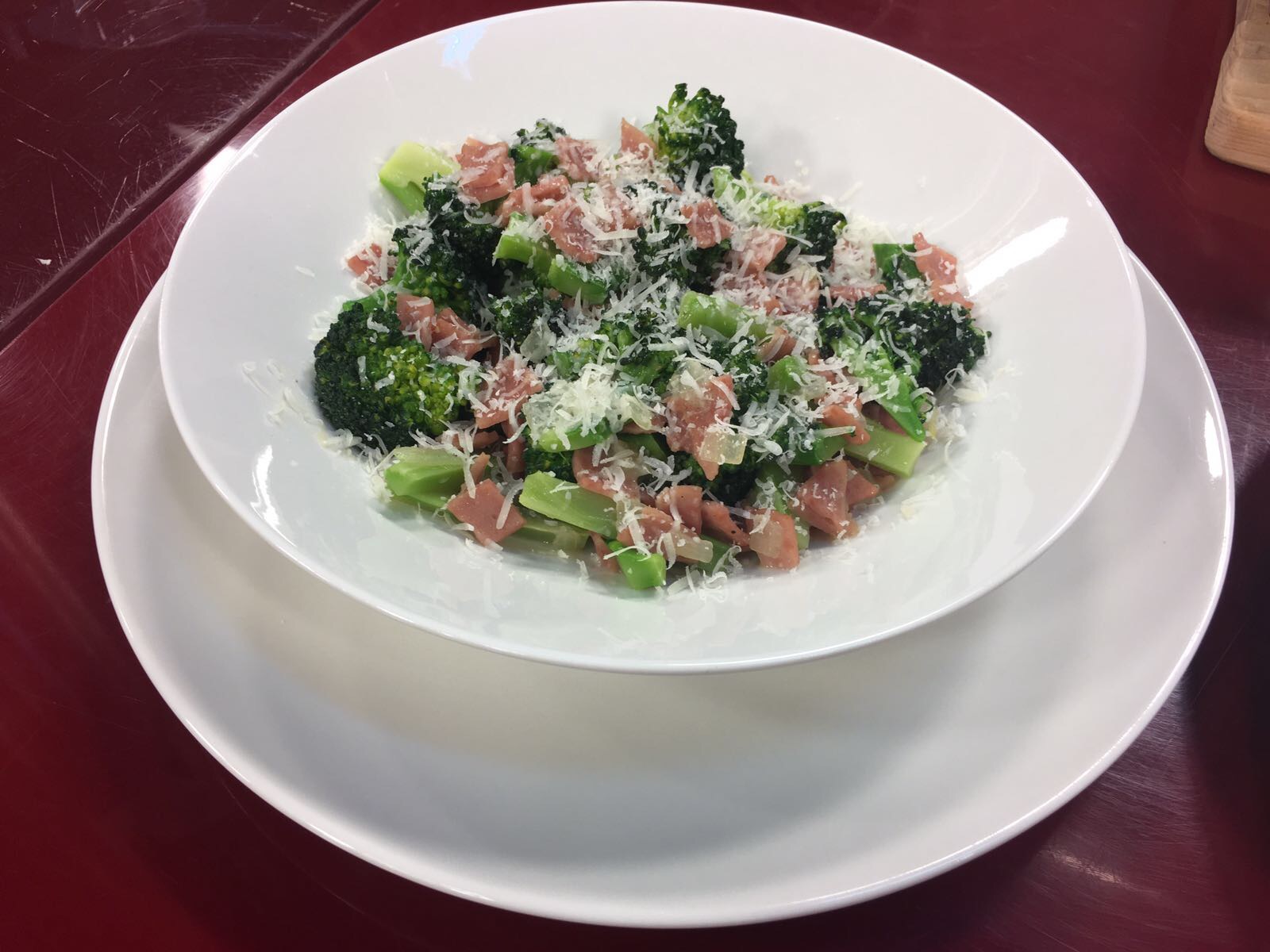 Pastrojmë brokolin, e presim atë në lule të vogla, e shpëlajmë mirë dhe e lemë të kullojë. Kërcellin e brokolit e qërojmë më pas dhe e presim në shkopinj me gjatësi 3 cm. Ngrohim vajin në tigan ku kaurdisim qepën dhe proshutën së bashku për 3 minuta. Më pas shtojmë brojolin së bashku me lëngun e perimeve dhe e lemë të ziejë për 3 minuta. Në fund e rregullojmë sallatën me kripë dhe piper të zi dhe e servirim pudrosur me pak djath parmixhano.