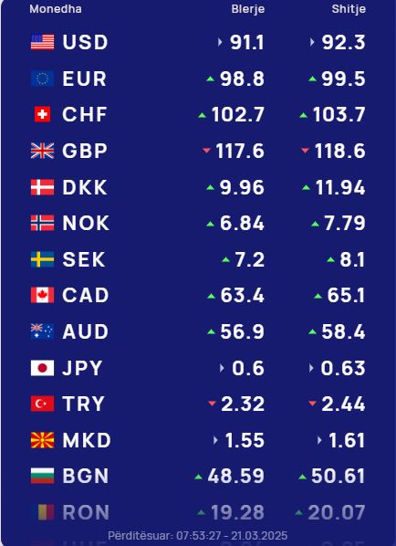Euroja blihet me 98.8 lekë dhe shitet me 99.5 lekë.