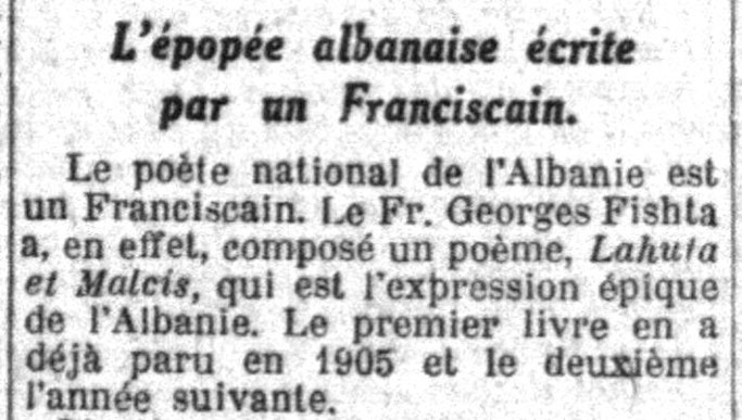 Epopeja shqiptare shkruar nga një françeskan. “Poeti kombëtar i Shqipërisë është një françeskan. At. Gjergj Fishta, ka shkruar, në fakt, një poemë, “Lahuta e Malcis”, e cila rrëfen epopenë e Shqipërisë. Libri i parë u botua në vitin 1905 dhe i dyti në vitin pasues.