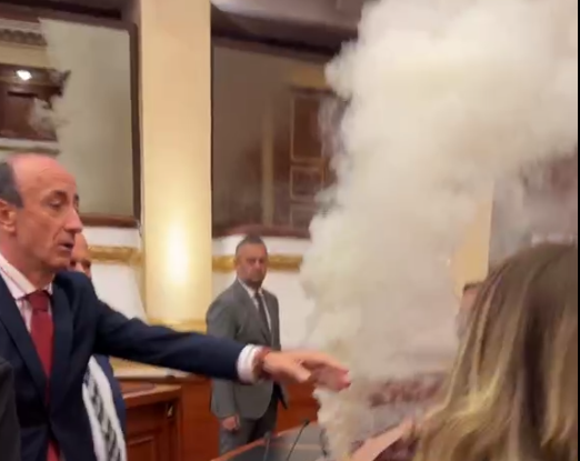 Nën thirrjet “turp, turp”, ata u përpoqën të parandalojnë zhvillimin e mëtejshëm. Në këtë moment, deputeti Saimir Korreshi ndezi një tymuese duke mbushur sallën me tym.