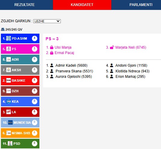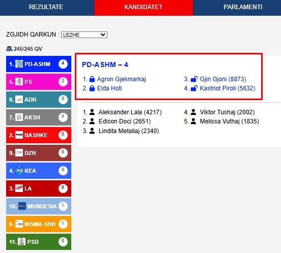 Kësisoj, PD çon në Kuvend nga Qarku i Lezhës Agron Gjekmarkajn, Elda Hotin, Gjin Gjonin dhe Kastriot Pirolin. Ndërsa socialistët Ulsi Manjën, Ermal Pacjan dhe Marjeta Nelin.