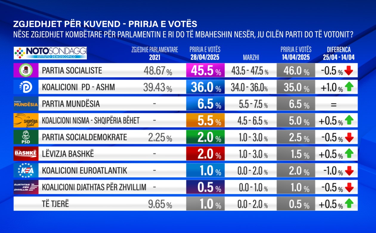 45.5% e qytetarëve janë përgjigjur se do të votonin Partinë Socialiste (varion 43.5%-47.5%). PS ka pësuar rënie me 0.5 krahasuar me sondazhin e 14 prillit. 36% do të votonin Partinë Demokratike dhe koalicionin e drejtuar prej saj Aleanca për Shqipërinë Madhështore (34%-36%). Opozita është rritur me 1% në krahasim me 2 javë më parë.