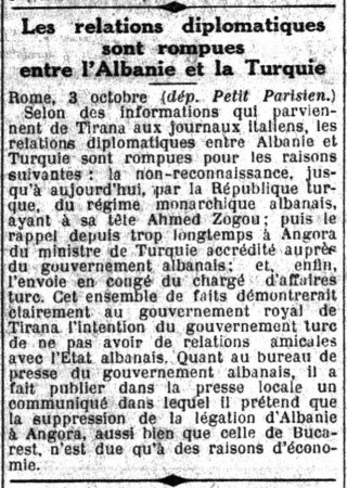 “Le Petit Parisien” ka botuar, të premten e 4 tetorit 1929, në faqen n°3, një shkrim në lidhje me marrëdhëniet e tensionuara diplomatike asokohe midis Shqipërisë dhe Turqisë, për shkak të tri çështjeve, të cilat i sjellim në vijim.