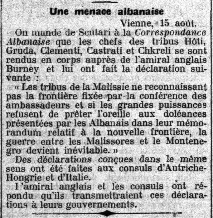 “Le Petit Parisien” ka botuar, të shtunën e 16 gushtit 1913, në faqen n°3, një shkrim mbi reagimin e fiseve të Malësisë kundër kufirit me Malin e Zi të vendosur në Konferencën e ambasadorëve në Londër.
