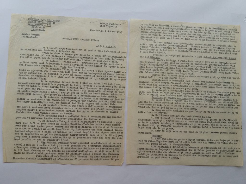 Raporti sekret drejtuar shtabit të divizionit 2, ku renditen emrat e kundërshtarëve të regjimit në Nikaj-Mërtur, Shalë e Shosh, Shllak e Drisht por edhe zona të tjera përreth.