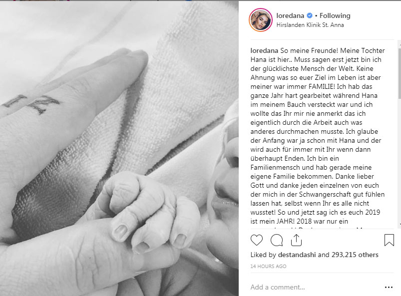 Loredana vetëm ditën e djeshme postoi një foot në Instagram ku lajmëronte se në vitin 2019 do të behëj nënë e një vajzë. Por me sa duket vogëlushja të cilën e pagëzuan me emrin Hana erdhi në jetë pikërisht ditën e djeshme më 18 dhjetor. Në fillim ishte Mozzik ai që postoi foton e parë të vajzës në Instagram bashkë me dedikimin dhe emocionin e parë për të bijën.
