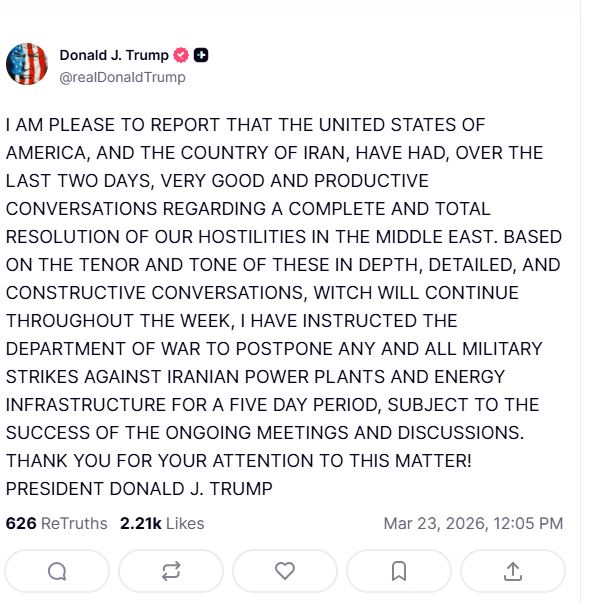 Bazuar në tonin e këtyre bisedave të thella, të detajuara dhe ndërtuese, të cilat do të vazhdojnë gjatë gjithë javës, kam udhëzuar Departamentin e Luftës të shtyjë çdo sulm ushtarak kundër centraleve elektrike dhe infrastrukturës energjetike iraniane për një periudhë pesë-ditore, në varësi të suksesit të takimeve dhe diskutimeve në vazhdim. Faleminderit për vëmendjen tuaj ndaj kësaj çështje! Presidenti Donald j. Trump.