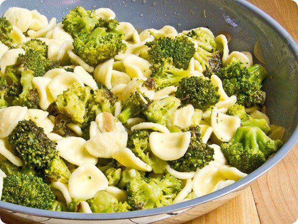 Fillimisht ndajmë lulet e brokolit nga kërcelli, i lajmë mirë me ujë të bollshëm dhe kërcellin e presim në copëza të vogla. Vendosim një tenxhere me ujë të bollshëm të vlojë, fillimisht vendosim në të copat e kërcellit të ziejnë, pas 5 minutash shtojmë lulet e brokolit dhe i lemë të ziejnë për 4-5 minuta. E largojmë brokolin duke e rregulluar dhe me kripë dhe më pas në po atë ujë ku përgatitëm brokolin vendosim makaronat dhe i lemë të ziejnë duke respektuar minutazhin e shkruar në etiketë. Në një tigan me vaj ulliri vendosim açuget, hudhrat e prera imët, specin djegës ashtu siç është dhe i lemë 2 minuta, më pas shtojmë brokolin duke e copëtuar pak me pirun, shtojmë dhe pak lëng makaronash. I trazojmë mirë të gjithë përbërësit dhe në fund shtojmë makaronat dhe djathin parmixhano.