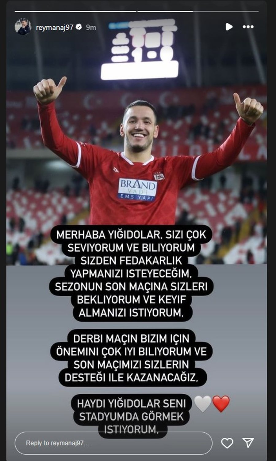 Sivasspor sfidon në ndeshjen e fundit të kampionatit skuadrën e Kayserispor. Sulmuesi kuqezi i Sivasspor, Rei Manaj ka bërë një postim në rrjetet sociale, ku fton tifozët që të jenë në stadium.
