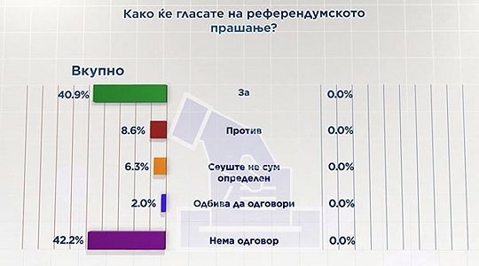 SHKUP- Në referendumin e ardhshëm 40,9 për qind e qytetarëve do të votojnë “pro”, “kundër” janë 6,6 për qind, të papërcaktuar 6,3 për qind, ndërsa dy për qind nga të anketuarit kanë refuzuar të përgjigjen. Pa përgjigje kanë qenë 42,2 për qind e të anketuarve.