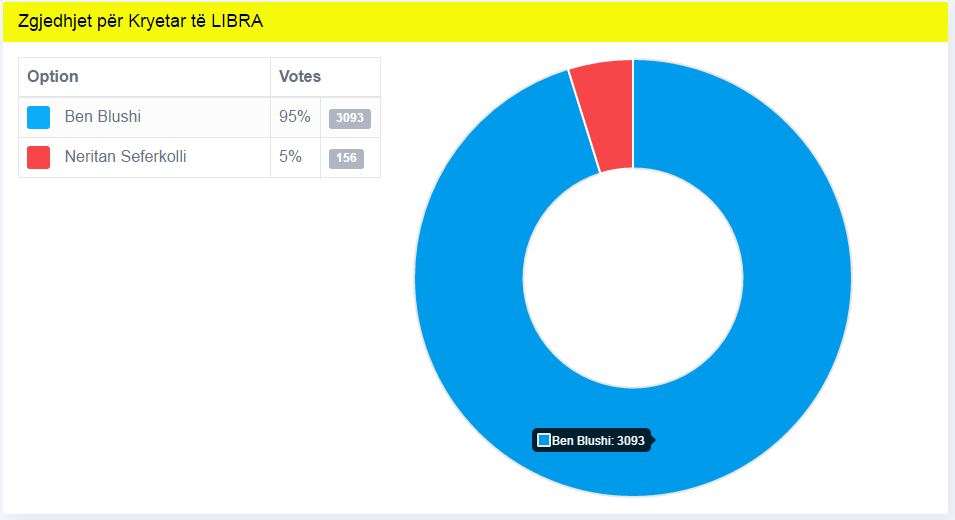 TIRANE– Ka përfunduar procesi i zgjedhjeve e brendshme të partisë LIBRA, proces i zhvilluar në mënyrë elektronike. Ben Blushi është zgjedhur kryetar i kësaj force politike me 95% të votave, ndërsa Neritan Seferkolli ka marrë 5 % të votave. Përkatësisht Blushi mori 3093 vota, kundrejt 156 votave të kandidatit tjetër Seferkolli.