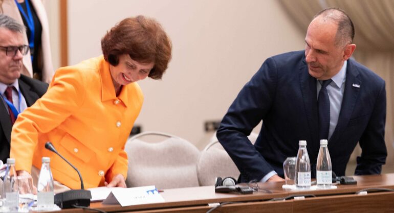Gjatë samitit të mbajtur sot në Shkup, presidentja u takua edhe me ministrin e Jashtëm të Greqisë, Giorgos Gerapetritis, ndërsa tha se ky i fundit nuk e hapi temën e emrit të Maqedonisë së Veriut.