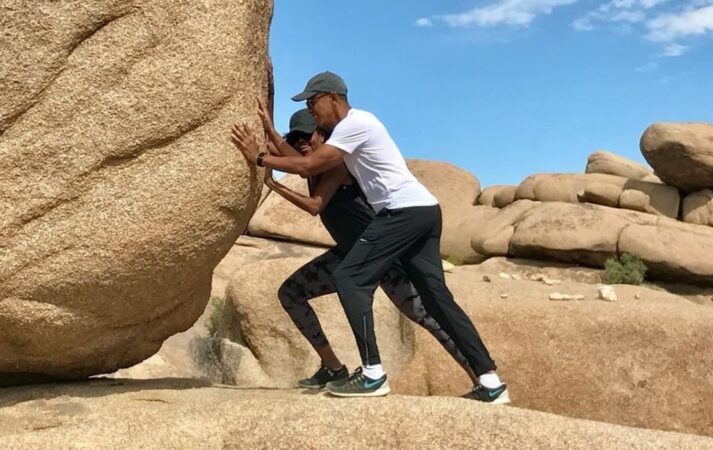Për ta plotësuar mesazhin e saj ajo shtoi një foto të saj dhe ish-presidentit të SHBA duke shtyrë një gur gjigant.
