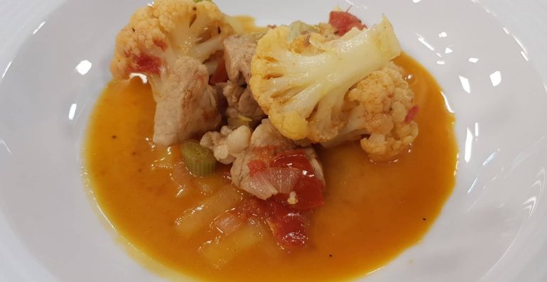 Më pas shtojmë 1 gotë lëng mishi dhe lulelakrën, ulim temeparturën dhe e lemë gatimin të ziejë sa më avash. Pasi të ketë përfunduar fikim sobën, e lemë në nxehtësinë e saj të ajkoset dhe më pas e servirim me koper ose majdanoz të freskët.