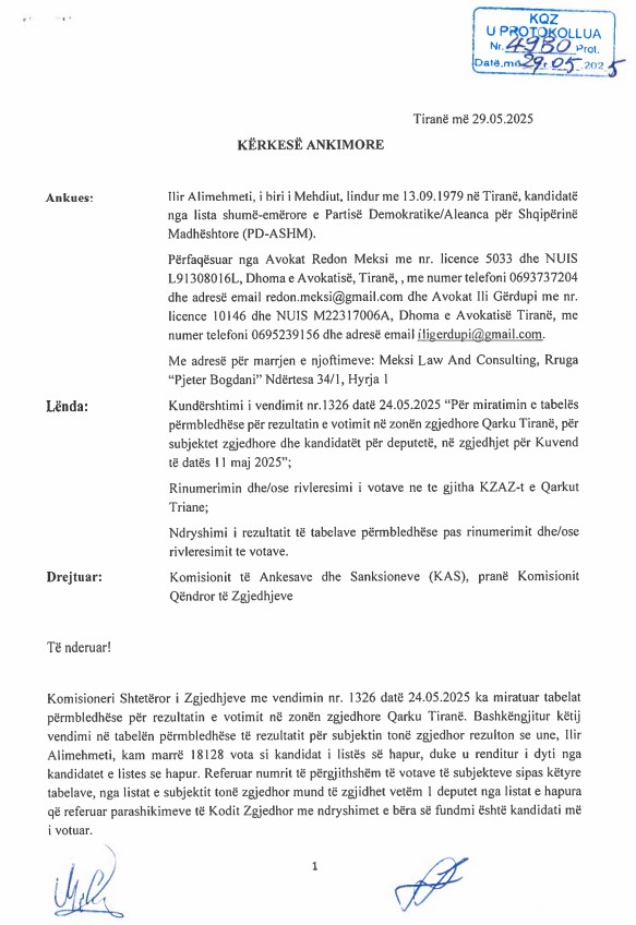“Komisioneri Shtetëror i Zgjedhjeve, me vendimin nr. 1326, datë 24.05.2025, ka miratuar tabelat përmbledhëse për rezultatin e votimit në zonën zgjedhore Qarku Tiranë. Bashkëngjitur këtij vendimi, në tabelën përmbledhëse të rezultatit për subjektin tonë zgjedhor, rezulton se unë, Ilir Alimehmeti, kam marrë 18,128 vota si kandidat i listës së hapur, duke u renditur i dyti nga kandidatët e listës së hapur. Referuar numrit të përgjithshëm të votave të subjekteve sipas këtyre tabelave, nga listat e subjektit tonë zgjedhor mund të zgjidhet vetëm 1 deputet nga listat e hapura, që referuar parashikimeve të Kodit Zgjedhor me ndryshimet e bëra së fundmi, është kandidati më i votuar.