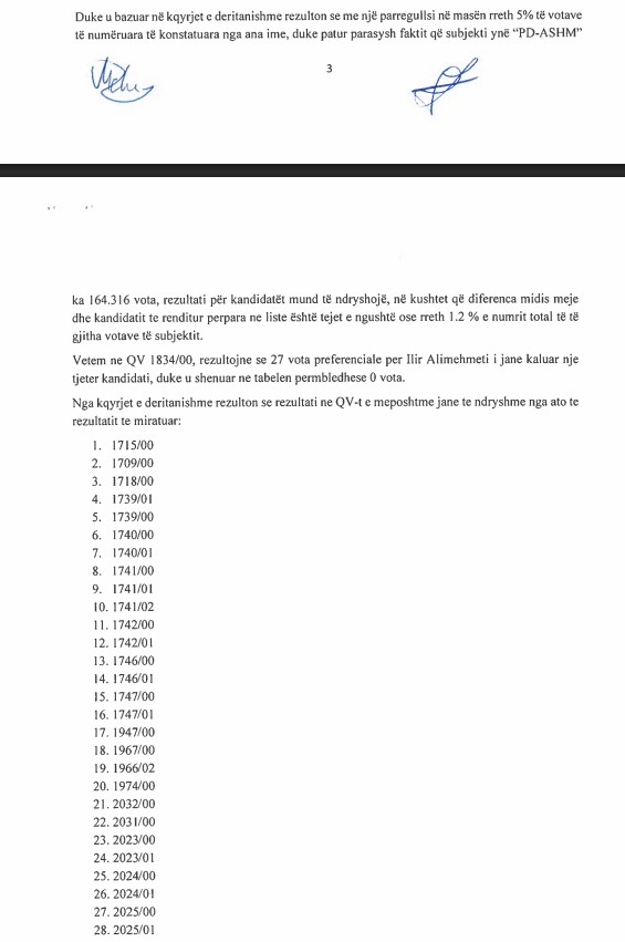 “Duke pasur parasysh faktin që subjekti ynë ‘PD-ASHM’ ka marrë 164,316 vota, rezultati për kandidatët mund të ndryshojë, në kushtet kur diferenca midis meje dhe kandidatit të renditur përpara në listë është tejet e ngushtë, ose rreth 1.2% e numrit total të të gjitha votave të subjektit. Vetëm në QV 1834/00, rezulton se 27 vota preferenciale për Ilir Alimehmeti i janë kaluar një tjetër kandidati, duke u shënuar në tabelën përmbledhëse 0 vota”, shkruan ai, duke renditur më pas edhe qendrat e votimit ku sipas tij ka pasur probleme të tilla.