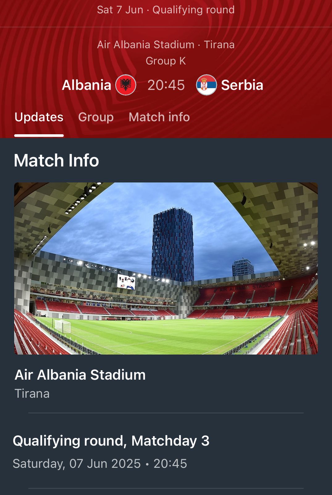 Shqipëria do të përballet me Serbinë në 7 qershor në orën 20:45, në ndeshjen e vlefshme për Grupin K në kualifikueset e Botërorit 2026-të.