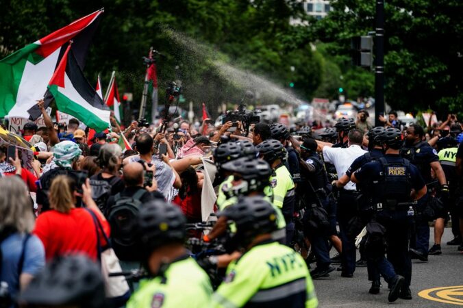 Teksa kryeministri izraelit Benjamin Netanyahu do t’i drejtohet Kongresit amerikan, disa qindra metra larg Capitol Hill mijëra njerëz janë mbledhur në shenjë proteste duke valëvitur flamurin palestinez.