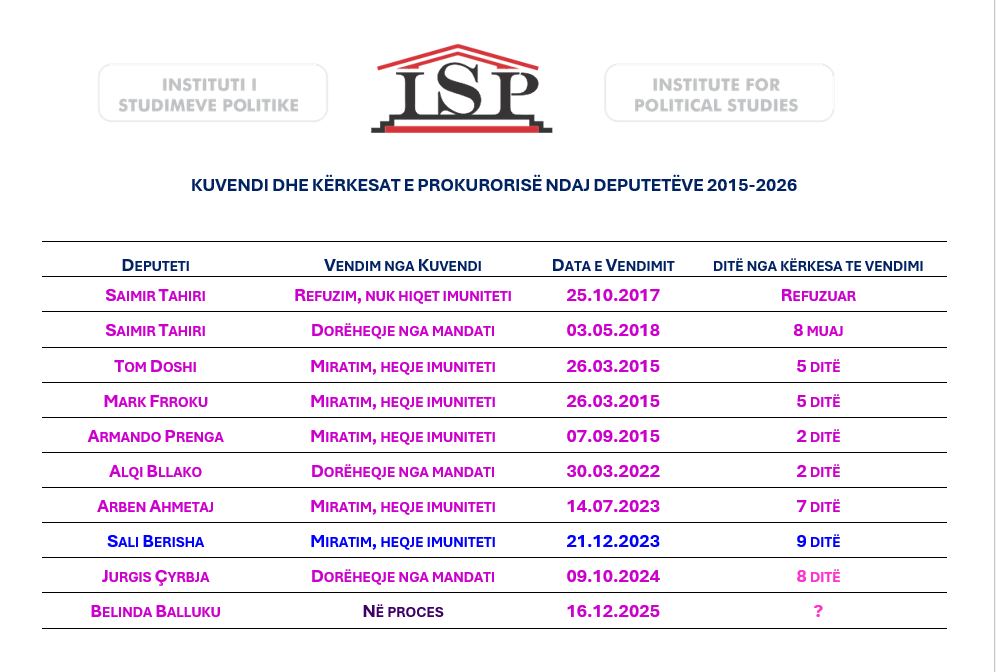 Instituti i Studimeve Politike (ISP), i cili po monitoron procesin dhe vendimmarrjet institucionale, rekomandon që Kuvendi të aplikojë standardet e vendeve të Bashkimit Europian, përfshirë praktikat e Parlamentit Europian, ku zyrtarët nën hetim përballen me drejtësinë pa mburojë politike. Sipas ISP-së, nëse një zyrtar shpallet i pafajshëm, ai fiton kredibilitet publik; nëse shpallet fajtor, përballet me pasojat ligjore – ndërsa në të dy rastet forcohet besimi te demokracia.