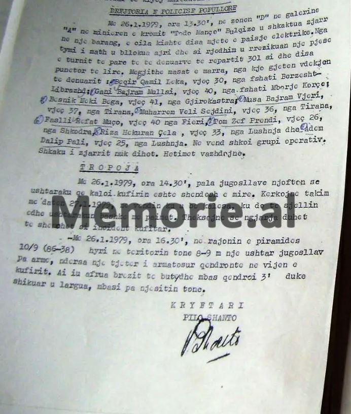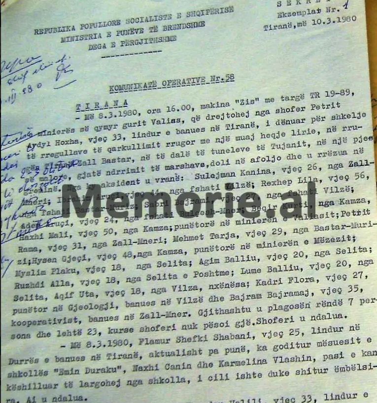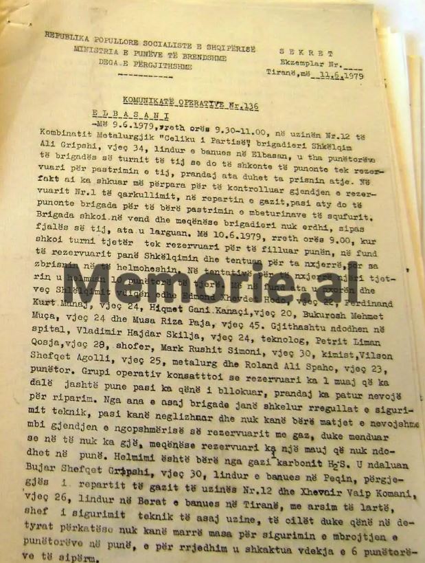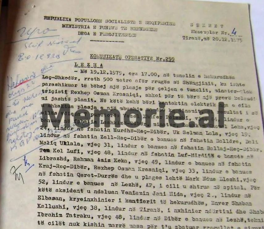 KOMUNIKATA OPERATIVE SEKRETE E MINISTRISË SË BRENDSHME, ME NJOFTIMIN PËR NGJARJEN NË MINIERËN E BULQIZËS, KU HUMBËN JETËN 9 TË BURGOSUR, QË VUANIN DËNIMIN NË ATË KAMP