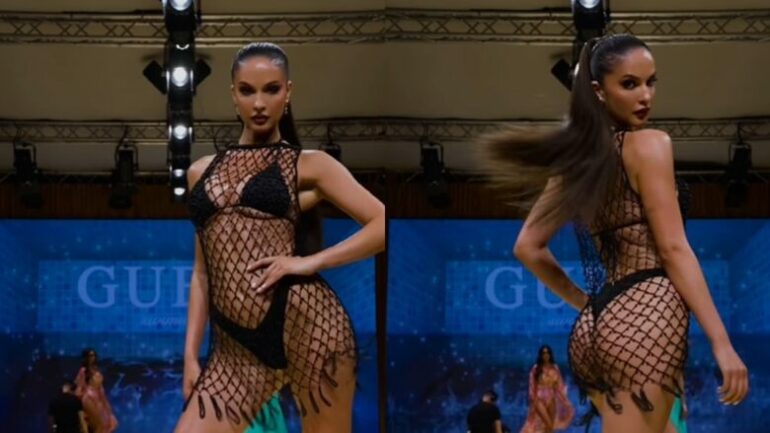 Në video, ajo paraqitet në bikini të zeza dhe një fustan rrjetë transparent, duke treguar linjat e saj të mahnitshme dhe stilin e mrekullueshëm.