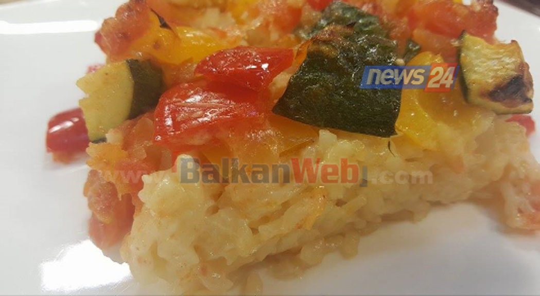 Ndërkohë perimet i prejmë në kubikë me brinjë 1 cm dhe në një tigan me pak vaj ulliri kaurdisim 1 kokërr qepë dhe një thelpi hudhër të grirë imët, më pas shtojmë specat dhe kungujt të cilat i kaurdisim për 5 minuta. I rregullojmë perimet me kripë dhe erëza dhe më pas shtojmë domatet dhe i trazojmë për një kohë të shkurtër. Në fund e rregullojmë përsëri shijen me kripë dhe piper të zi.