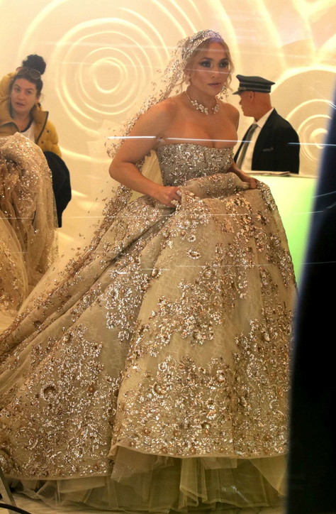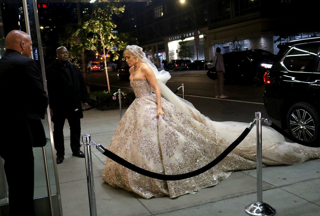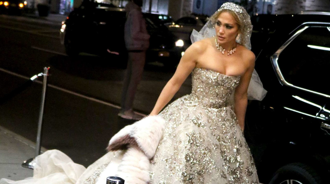 Jennifer Lopez duket mahnitëse e veshur me fustan nusërie teksa shihet duke dalë nga xhirimet e filmit të saj më të fundit “Marry Me”.
