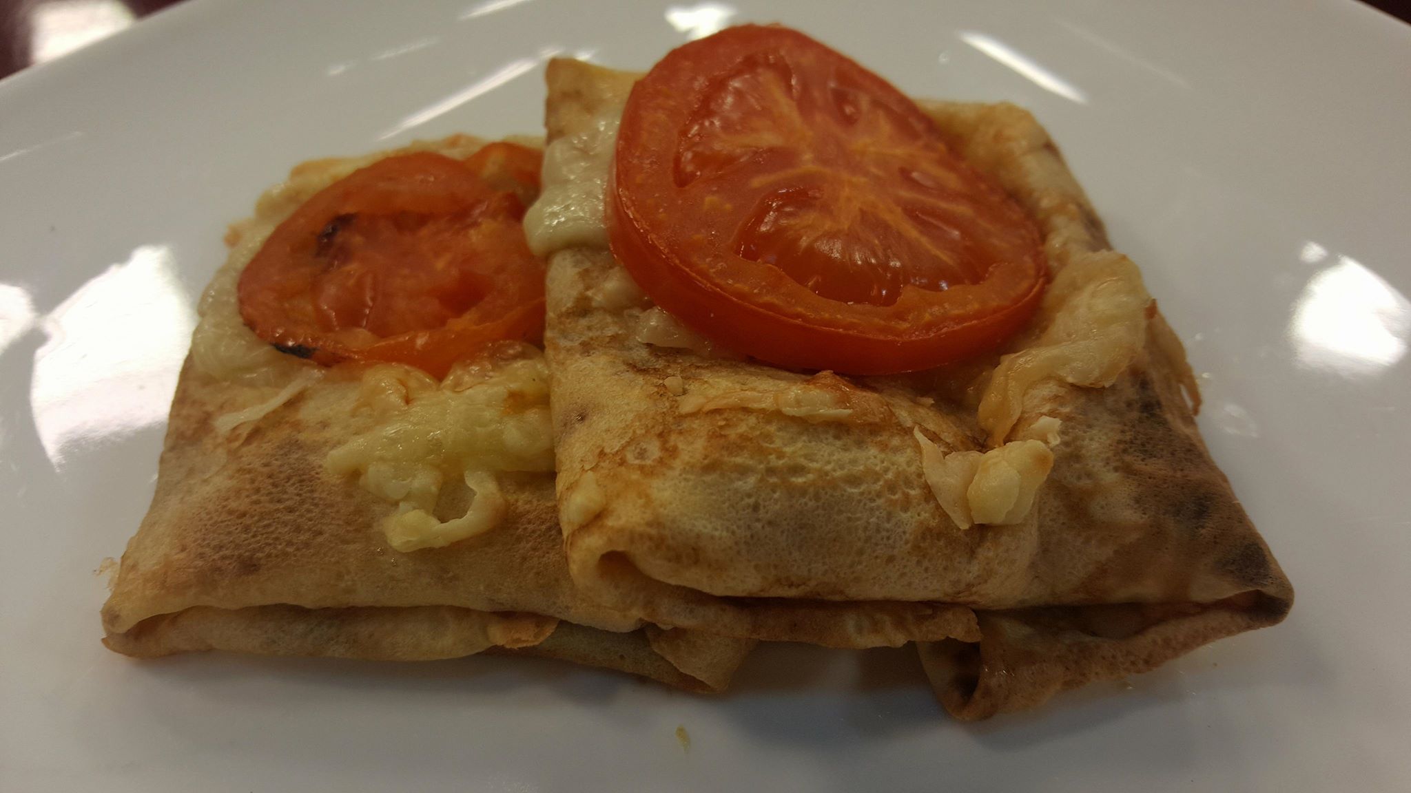 Fillojmë mbushjen e krepave duke vendosur nje krem në tavolinën punës, në qendër të tij vendosim kimë dhe e palosim krepin fillimisht dy pjesët anësore dhe më pas 2 anët e tjera derisa të formohet një bohçe drejtkëndore. Lyejmë më pas një tepsi me pak gjalpë dhe vendosim të gjithë krepat e mbushur duke e vendosur palosjen nga poshtë. Mbi çdo krep të mbushur vendosim pak djath kaçkavall të grirë e mbi të nga një fetë domate. E vendosim tavën në furrë në temperaturën 200 gradë Celsius për 20 minuta derisa djathi të shkrijë.