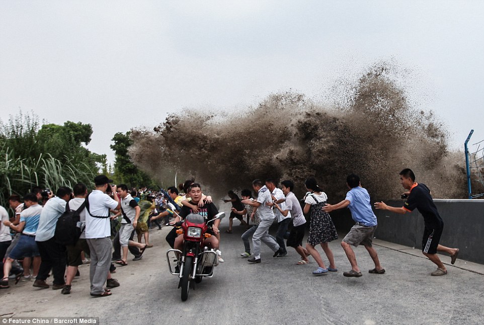 Njërëzit ishin ishin mbledhur të shihnin momentin e rrallë në qytetin e Hainanit. Terreni në zonë është mjaft kompleks dhe pikërisht në sajë të tij, arrijnë të krijohen lloje të ndryshme dallgësh të larta shkruan Daili Mail.